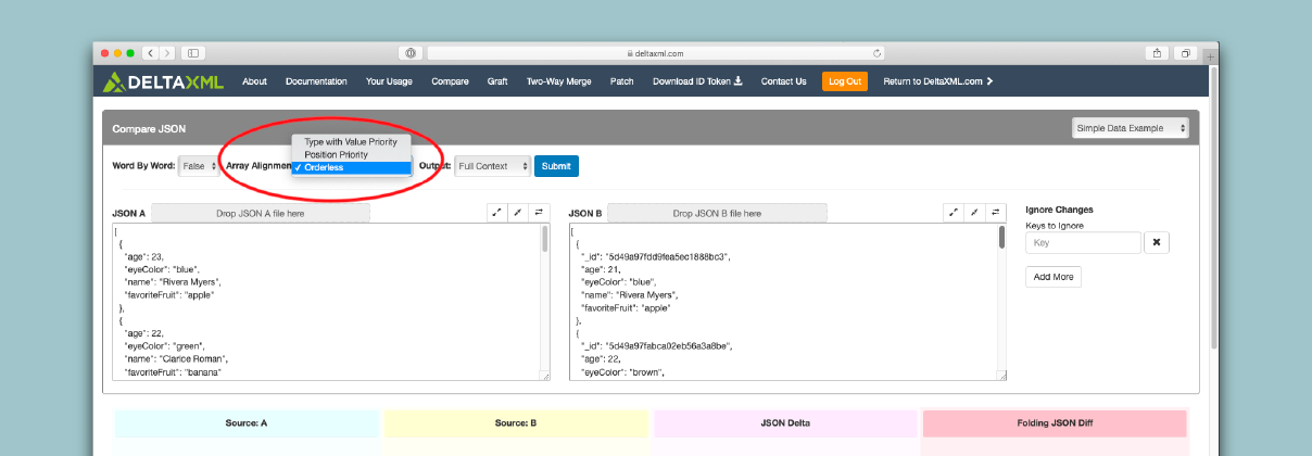 JSON arrays are often used to hold data that has been dumped out of an application or database, so the order of items in the array is not important and needs to be ignored. So how then do we align the items in two arrays, one from document A and one from document B, that we are comparing?