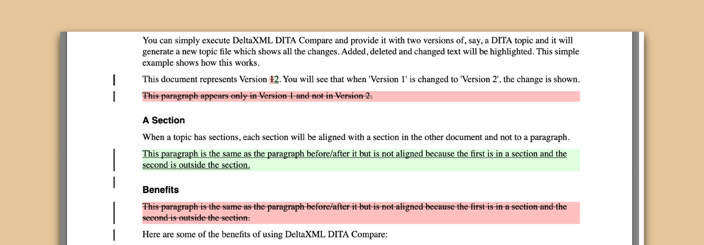 DITA Compare and DITA Merge deliver results that can be easily marked up for processing as redline documents or integrated with popular editing software such as OxygenXML, XMetal, and Arbortext. The redline markup is also compatible with the DITA Open Toolkit for generating PDFs for publication, while the markup for editing software serves the needs of technical writers.