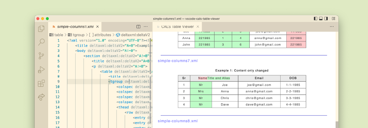 To work effectively with these files, we needed to render the XML as regular tables with colour highlighting describing the differences. For this, we developed XSLT to render CALS tables in the XML as HTML that could be opened in any browser.
